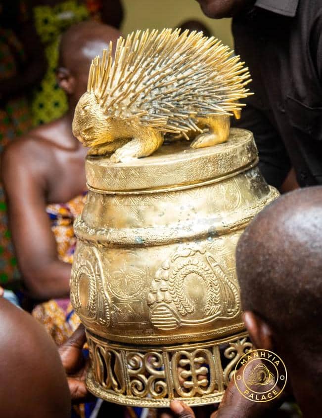 As custom demands, Mr Ackuaku, on behalf of the team, presented gifts to the Asantehene, including a beautifully crafted golden pot with a porcupine emblem (Kotokohene Kuduo), Otumfuo headgear, Adinkra symbols, and other Asante-inspired geometric motifs.