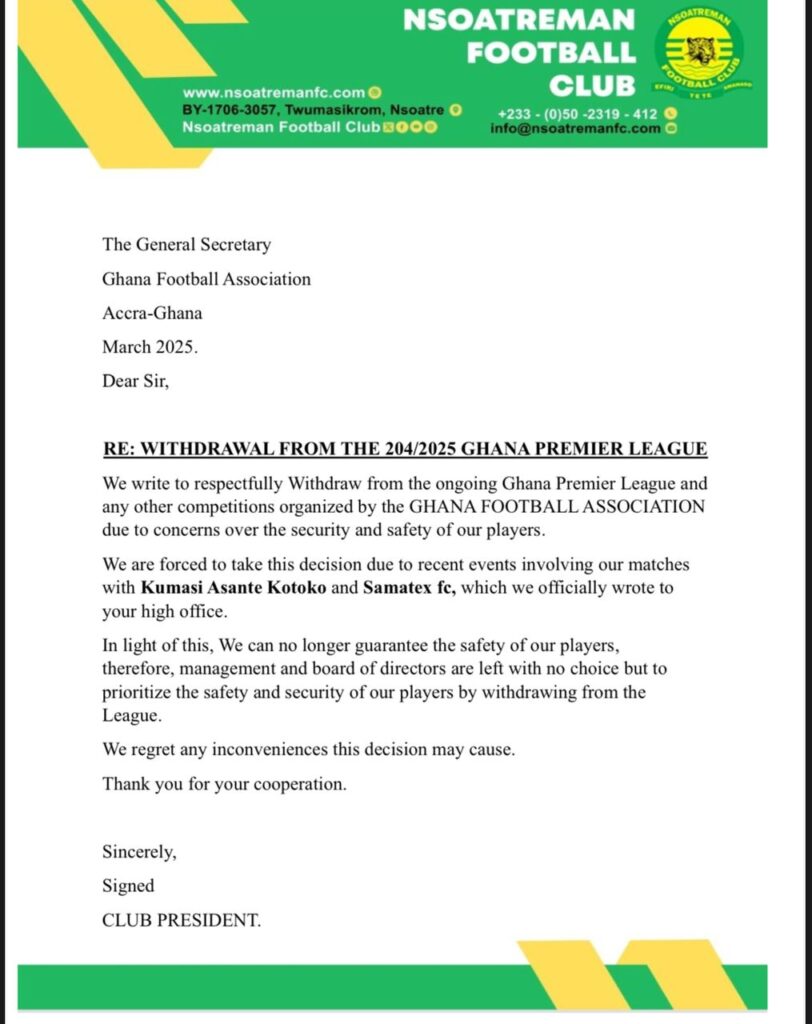 “We write to respectfully withdraw from the ongoing Ghana Premier League and any other competitions organised by the GFA due to concerns over the security and safety of our players.